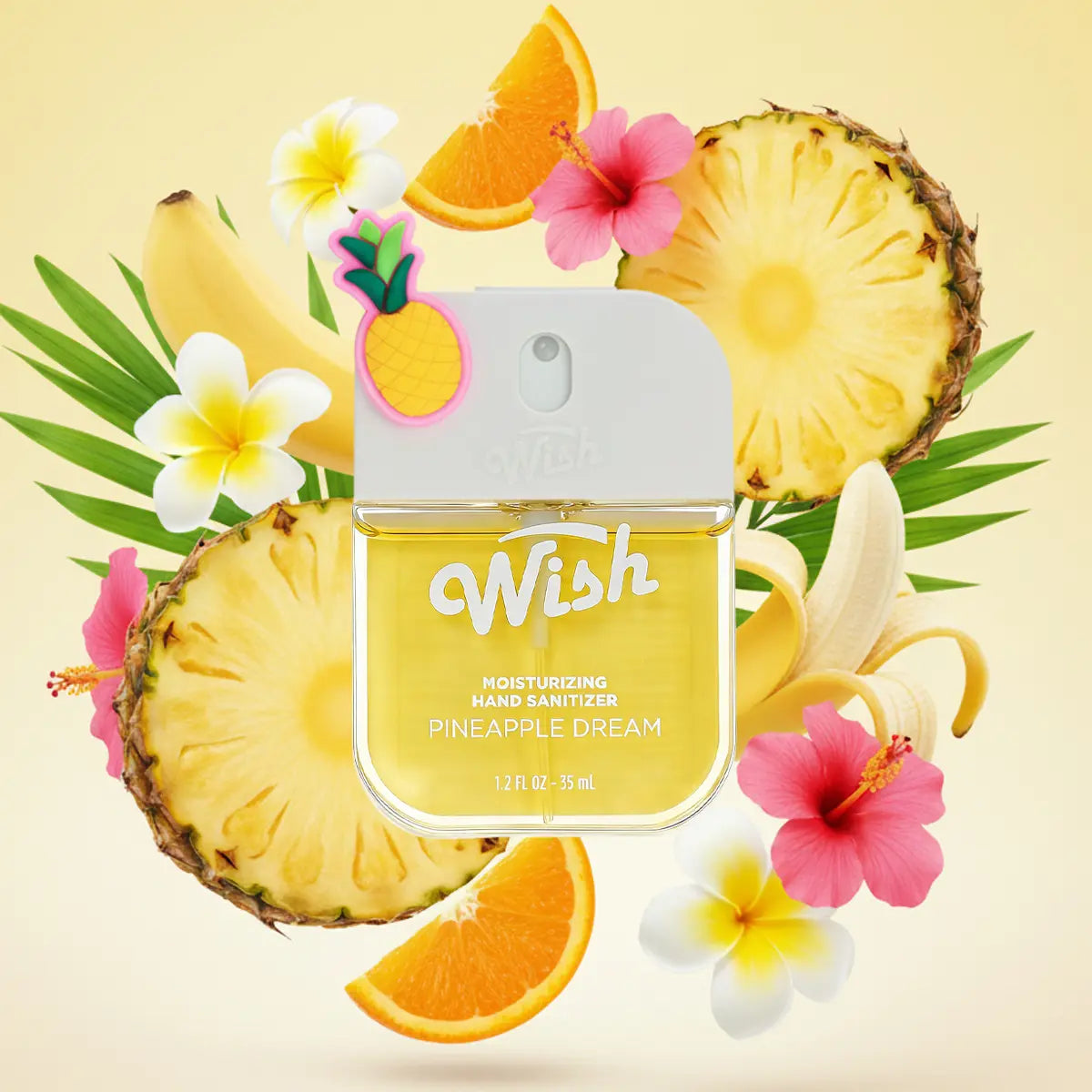 Sun-kissed pineapple juice, sweet citrus, and crisp apple blend into a summer smoothie vibe that instantly transports you to island mode.Feel the energy by the pool, the refreshing coolness of a smoothie, and the vibe of a tropical beach. The 70% alcohol formula effectively kills germs and cleans your hands without needing water. Comes with a detachable silicone charm for endless DIY fun.